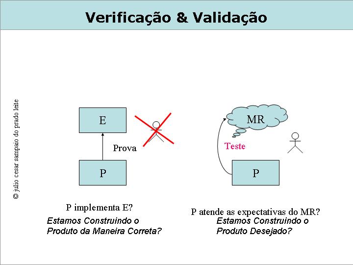 A verificação pode ser feita no domínio da engenharia de software, mas a validação requer a participação de clientes, afinal são deles as expectativas que o software deve atender.